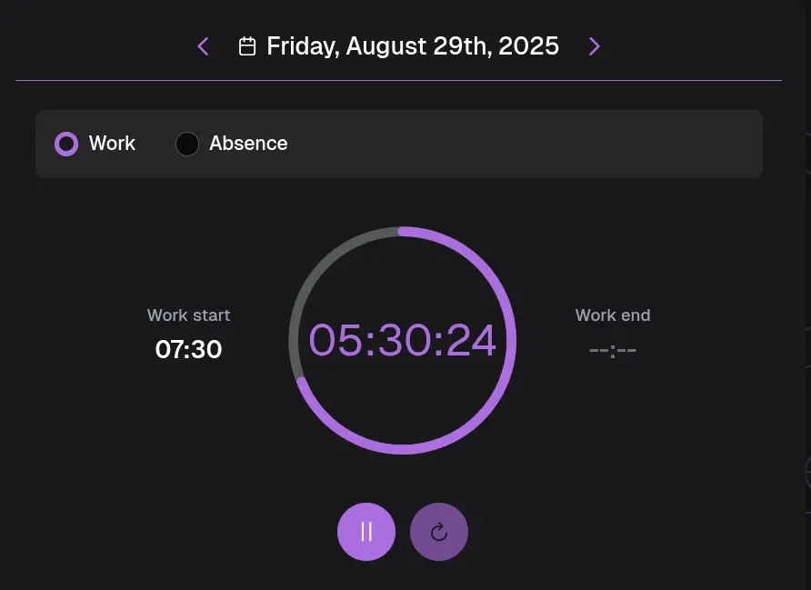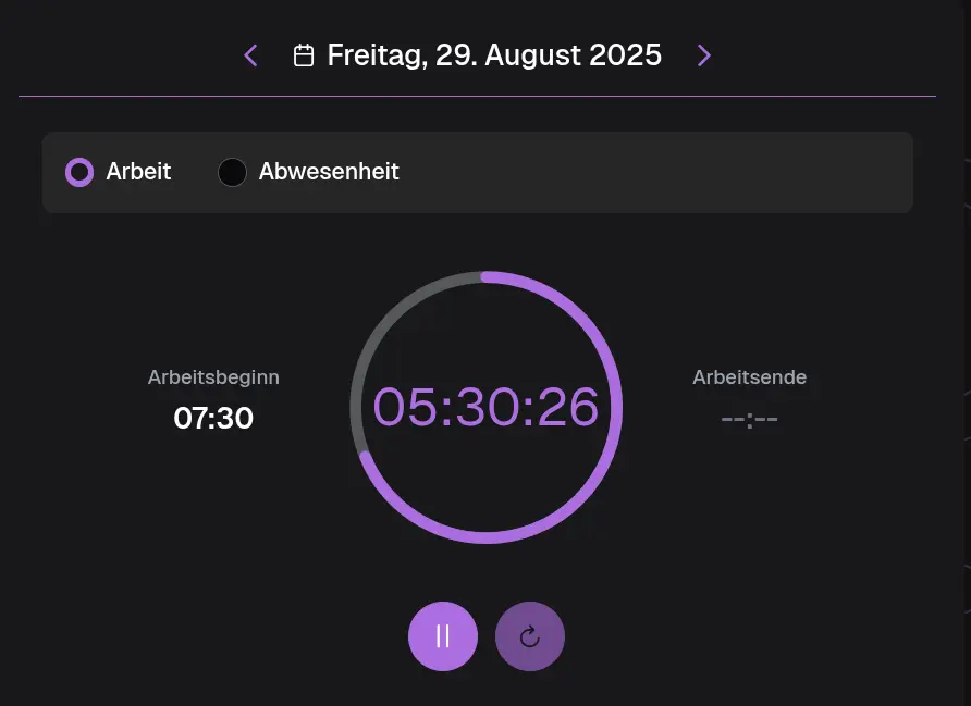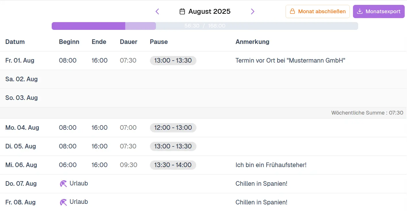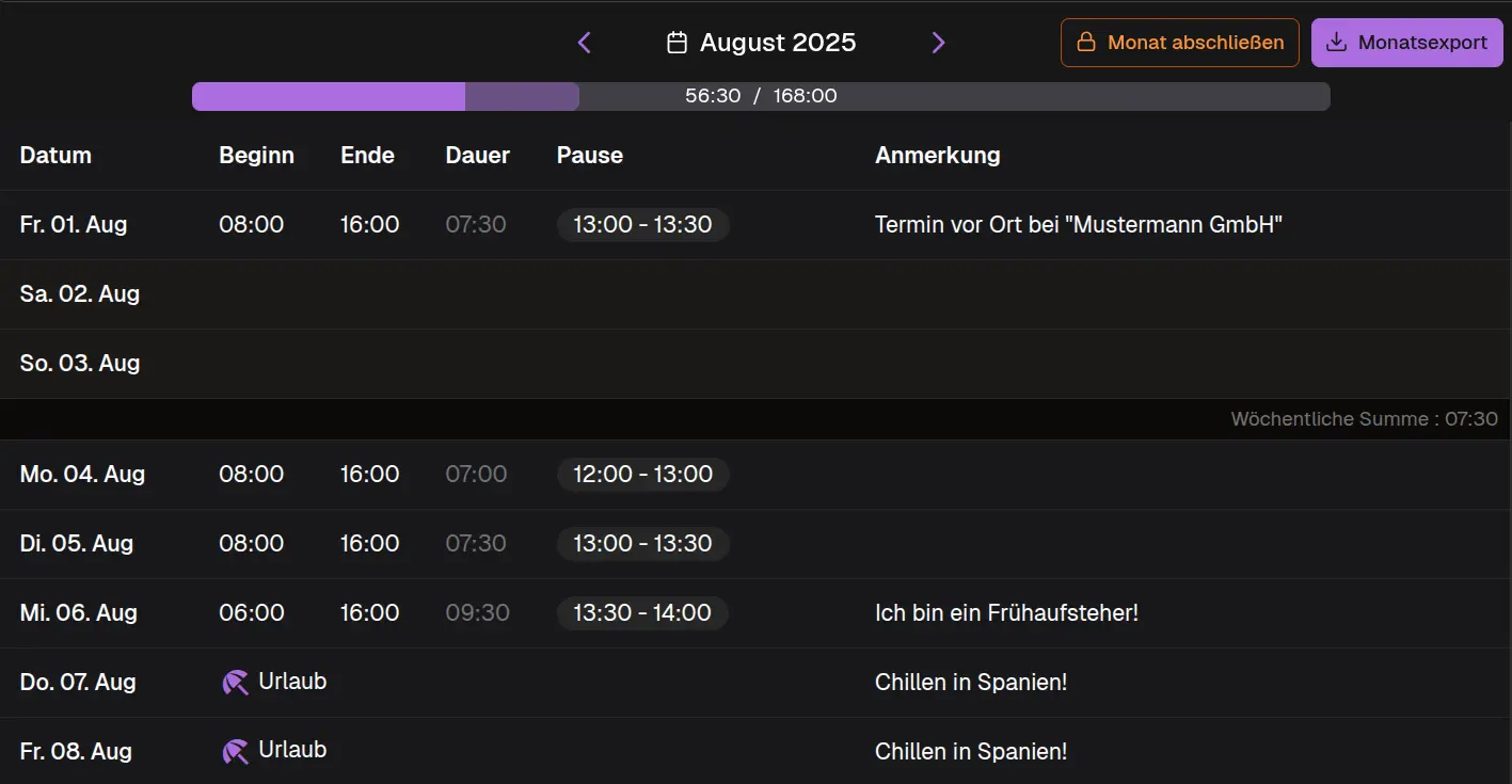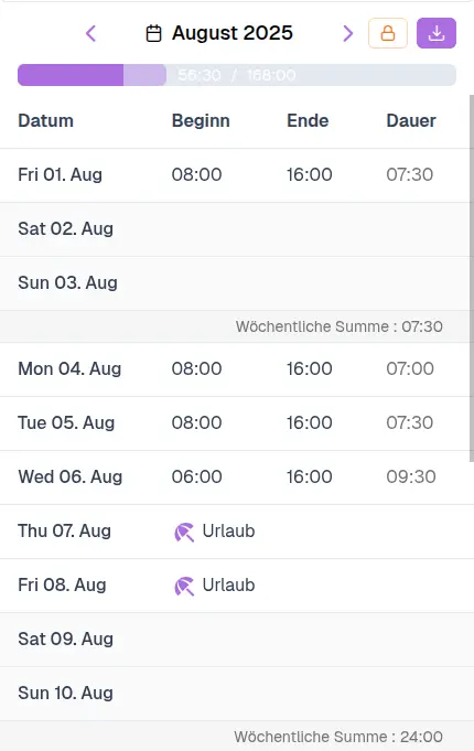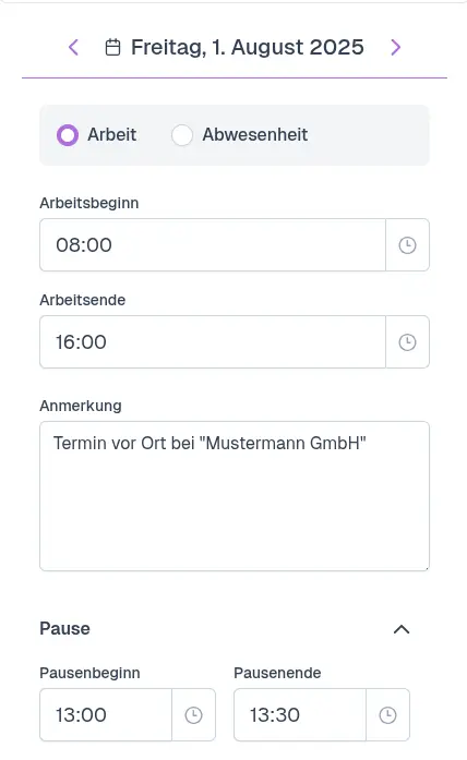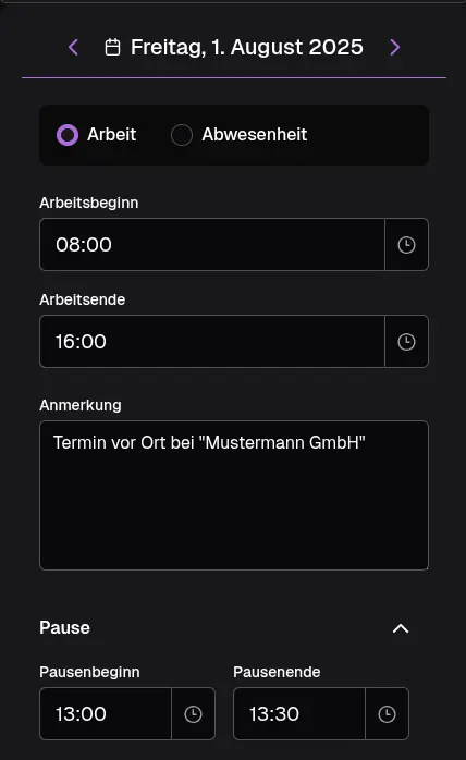 Trage Arbeitszeiten ein, inklusive Abwesenheiten.