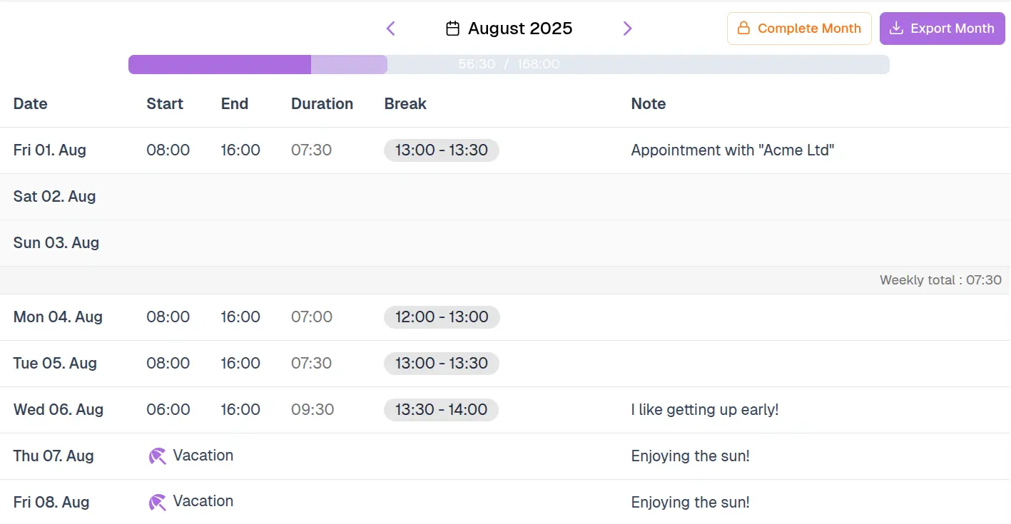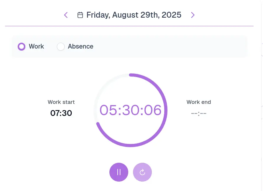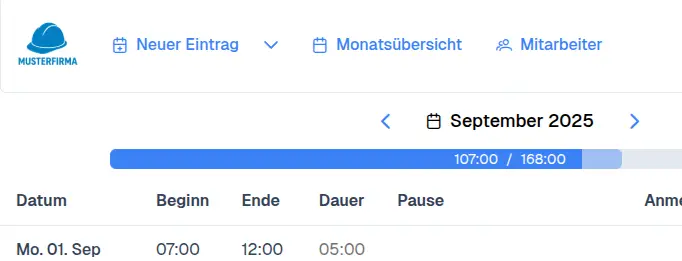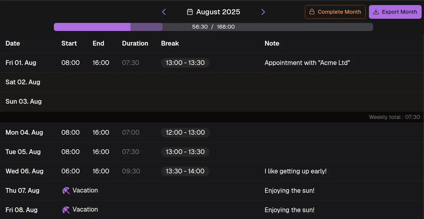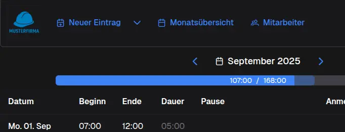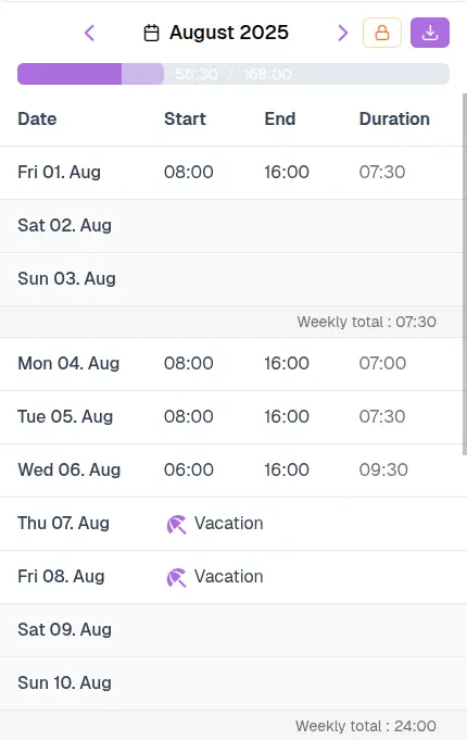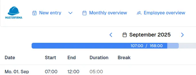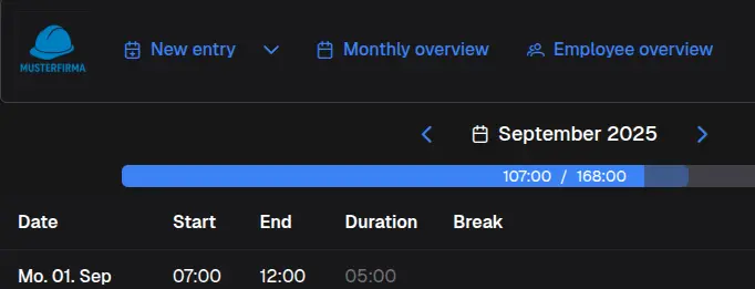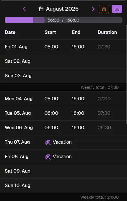 Trage Arbeitszeiten ein, inklusive Abwesenheiten.