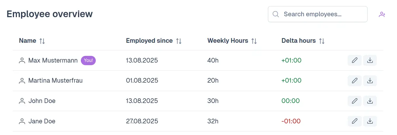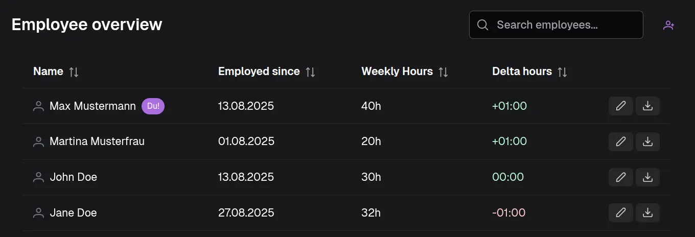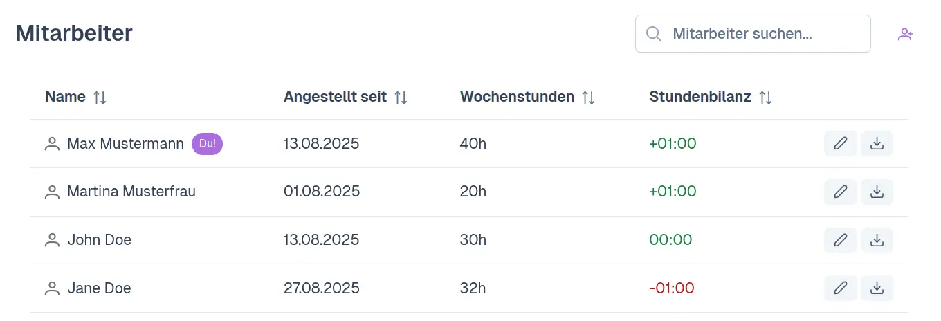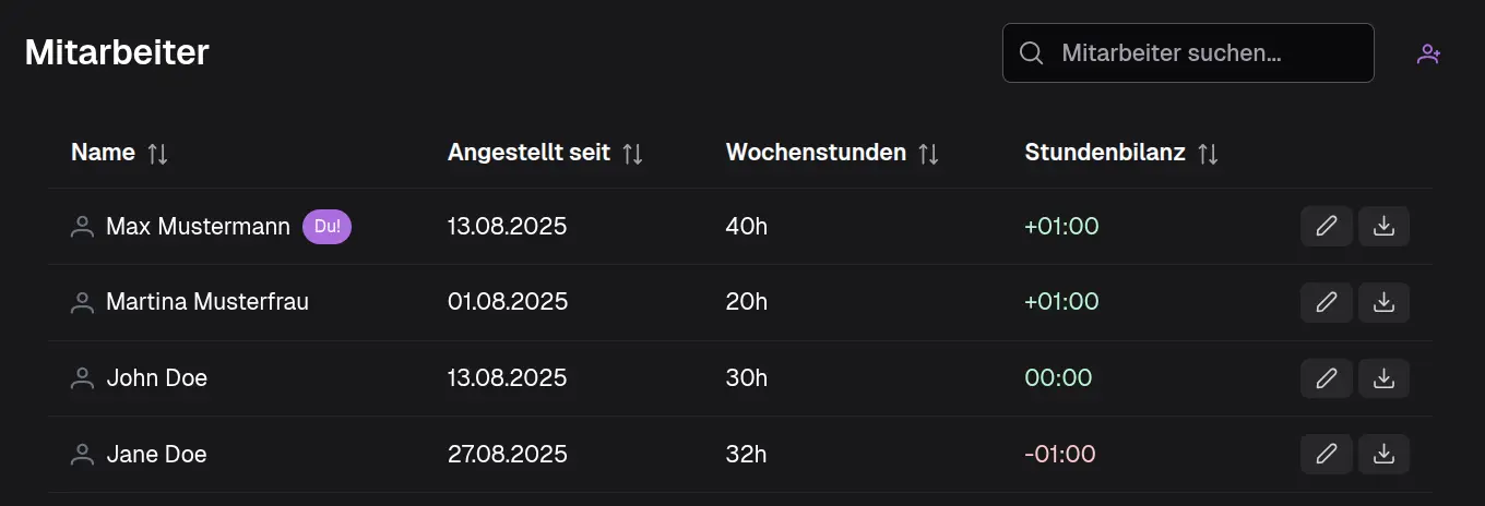 Verwalte die Arbeitszeiten deiner Mitarbeiter und passe Wochenstunden und Berechtigungen an.